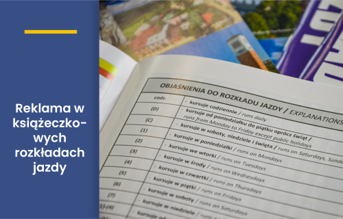 - Reklama graficzna na drukowanych książeczkowych rozkładach jazdy dystrybuowanych wśród pasażerów